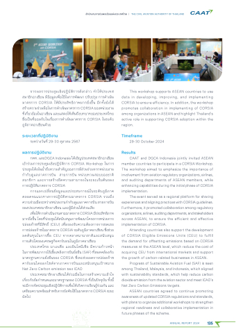 This workshop supports ASEAN countries to use data in developing, improving, and implementing CORSIA to ensure efficiency. In addition, the workshop promotes collaboration in implementing of CORSIA among organizations in ASEAN and highlight Thailand's active role in supporting CORSIA adoption within the region.