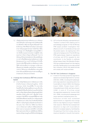 1.2 เปี็นผู้้้แที่นหน่วยปีระสำานจัด้สำรรเวลาการบิินของ ปีระเที่ศไที่ยในการเข้าปีระชุ่ม HOD รบิั ฟื้ังปีระเด้็น คัวามคั้บิหน้าการพิ่ิจารณ์าปีัญหาเคัรอ้ งยนตั์ Pratt & Whitney (PW) ที่่ม่ผู้ลกระที่บิตั่ออากาศยานของ สำายการบิินและอุตัสำาหกรรมการบิินที่ัวโลก ซึ่ึงใน การปีระชุ่ม IATA ซึ่ึงเปี็นผู้้้จัด้การปีระชุ่มได้้ม่การ กล่าวถึึงที่่มาของผู้ลกระที่บิตั่อการปีฏิิบิัตัิการบิิน ของสำายการบิินจากปีัญหาเคัร้องยนตั์ Pratt & Whitney (PW) ผู้ลกระที่บิตั่อสำายการบินิ และขอ้ รอ้ งขอ จาก IATA ที่่ขอให้หน่วยปีระสำานจด้ั สำรรเวลาการบิิน ย้ด้หยุ่นและที่ําาคัวามเข้าใจถึึงปีัญหาที่่เกิด้ขึน กบิั สำายการบินิ ที่งั นก่ องบิรหิ ารการจด้ั สำรรเวลาการบินิ ได้้ม่การนําาปีระเด้็นจากการปีระชุ่มฯ มาพิ่ิจารณ์า เปีน็ แนวที่างการผู้อ่ นผู้นั Justified Non-Utilization (JNUS) ให้กับิสำายการบิินเพิ่้อเปี็นการช่่วยเหล้อ สำายการบินิ และเปีน็ ไปีตัามแนวที่างสำากลบินพิ่น้ ฐาน ตั่างตัอบิแที่น (Reciprocal Basis)