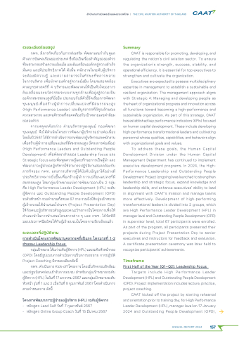 To address these goals, the Human Capital Development Division under the Human Capital Management Department has continued to implement executive development programs. In 2024, the High- Performance Leadership and Outstanding People Development Project (ongoing) was launched to strengthen leadership and strategic focus, expand knowledge and leadership skills, and enhance executives’ ability to lead in alignment with CAAT’s mission and manage teams more effectively. Development of high-performing transformational leaders is divided into 2 groups, which are High Performance Leader Development (HPL) in manager level and Outstanding People Development (OPD) in supervisor level, total 67 participants were enrolled. As part of the program, all participants presented their projects during Project Presentation Day to senior executives and instructors for feedback and evaluation. A certificate presentation ceremony was later held to recognize participants’ achievements.