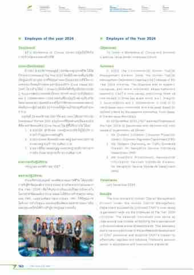 The Environmental Human Capital Management Division under the Human Capital Management Department successfully promoted CAAT’s core values organization-wide via the Employee of the Year 2024 initiative. The selected individuals now serve as inspirational role models, embodying the organizational culture and values across all departments. Their exemplary performance contributes to the professional development of CAAT personnel and supports CAAT’s mission to effectively regulate and advance Thailand’s aviation sector in accordance with international standards.