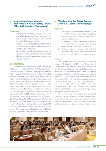 การสำัมมนาด้้านคัวามปีลอด้ภัยในการบิินน่ จัด้ขึนเม้อวันที่่ 13 ธนั วาคัม 2567 ณ์ โรงแรมมิราเคัิล แกรนด้์คัอนเวนช่นั กรุงเที่พิ่ฯ และการถึ่ายที่อด้สำด้บิน Microsoft Team ม่ผู้้้เข้าร่วมงานที่ังสำิน 428 คัน แบิ่งออกเปี็นผู้้้เข้าร่วมปีระชุ่ม ณ์ โรงแรมฯ จําานวน 250 คัน และผู้่าน Microsoft Team จําานวน 178 คัน ซึ่ึงปีระกอบิไปีด้้วย ผู้บิ้้ รหิ ารและพิ่นกั งานของสำําานกั งานการบินิ พิ่ลเรอ้ นแห่งปีระเที่ศไที่ย สำําานักงานคัณ์ะกรรมการคั้นหาและช่่วยเหล้ออากาศยานและเรอ้ ที่่ปีระสำบิภัย (สำกช่ย.) Aviation Language Proficiency Testing Center (LPC) บิรษิ ัที่ วิที่ยุการบิินแห่งปีระเที่ศไที่ย จําากัด้ (บิวที่.) กรมที่่าอากาศยาน บิริษัที่ ที่่าอากาศยานไที่ย จําากัด้ (มหาช่น) การที่่าอากาศยานอ่้ตัะเภา โรงเรย่ นการบิิน ผู้้้ด้ําาเนินการเด้ินอากาศ หน่วยงานราช่การที่ม่ ก่ ารปีฏิิบิตัั ิการบินิ International Civil Aviation English Association และสำมาคัมการบิินตั่าง ๆ โด้ยเน้อหา ในการสำัมมนาปีระกอบิด้้วย สำถึิตัิและแนวโน้มของการเกิด้เหตักุ ารณ์์ ด้้านคัวามปีลอด้ภัยที่่เก่ยวข้องกับิการสำ้อสำาร มาตัรฐานสำากลใน การสำ้อสำารด้้านการบิิน การจัด้ที่ําาและพิ่ัฒนามาตัรฐานของ ICAO การกําากับิด้้แลด้้านคัวามปีลอด้ภัย การที่ด้สำอบิคัวามสำามารถึ ที่างภาษาอังกฤษ และการแลกเปีล่ยนปีระสำบิการณ์์ กรณ์่ตััวอย่าง รวมถึึงแนวปีฏิิบิัตัิที่่ด้่จากแตั่ละองคั์กรในอุตัสำาหกรรมการบิิน