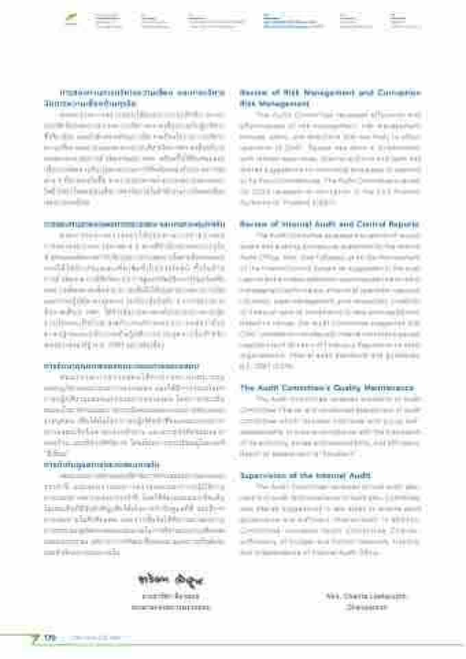 The Audit Committee reviewed the reports of various audits and auditing procedures presented by the Internal Audit Office. Also, they followed up on the improvement of the internal control system as suggested in the audit reports and provided additional recommendations to refine management performance, in terms of operation, resource utilization, asset management, error protection, credibility of financial reports, compliance to laws and regulations. Based on review, the Audit Committee suggested that CAATconsistentlycomplieswithinternalcontrolprocedures, regulations of Ministry of Finance’s Regulation on state organizations’ internal audit standards and guidelines, B.E. 2561 (2018).