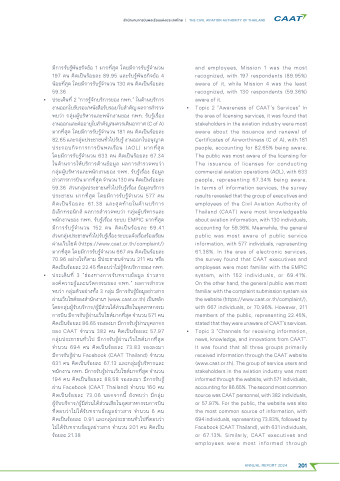 Topic 2 “Awareness of CAAT’s Services” In the area of licensing services, it was found that stakeholders in the aviation industry were most aware about the issuance and renewal of Certificates of Airworthiness (C of A), with 181 people, accounting for 82.65% being aware. The public was most aware of the licensing for The issuance of licenses for conducting commercial aviation operations (AOL), with 633 people, representing 67.34% being aware. In terms of information services, the survey results revealed that the group of executives and employees of the Civil Aviation Authority of Thailand (CAAT) were most knowledgeable about aviation information, with 130 individuals, accounting for 59.36%. Meanwhile, the general public was most aware of public service information, with 577 individuals, representing 61.38%. In the area of electronic services, the survey found that CAAT executives and employees were most familiar with the EMPIC system, with 152 individuals, or 69.41%. On the other hand, the general public was most familiar with the complaint submission system via the website (https://www.caat.or.th/complaint/), with 667 individuals, or 70.96%. However, 211 members of the public, representing 22.45%, stated that they were unaware of CAAT’s services. Topic 3 “Channels for receiving information, news, knowledge, and innovations from CAAT”. It was found that all three groups primarily received information through the CAAT website (www.caat.or.th). The group of service users and stakeholders in the aviation industry was most informed through the website, with 571 individuals, accounting for 86.65%. The second most common source was CAAT personnel, with 382 individuals, or 57.97%. For the public, the website was also the most common source of information, with 694 individuals, representing 73.83%, followed by Facebook (CAAT Thailand), with 631 individuals, or 67.13%. Similarly, CAAT executives and employees were most informed through