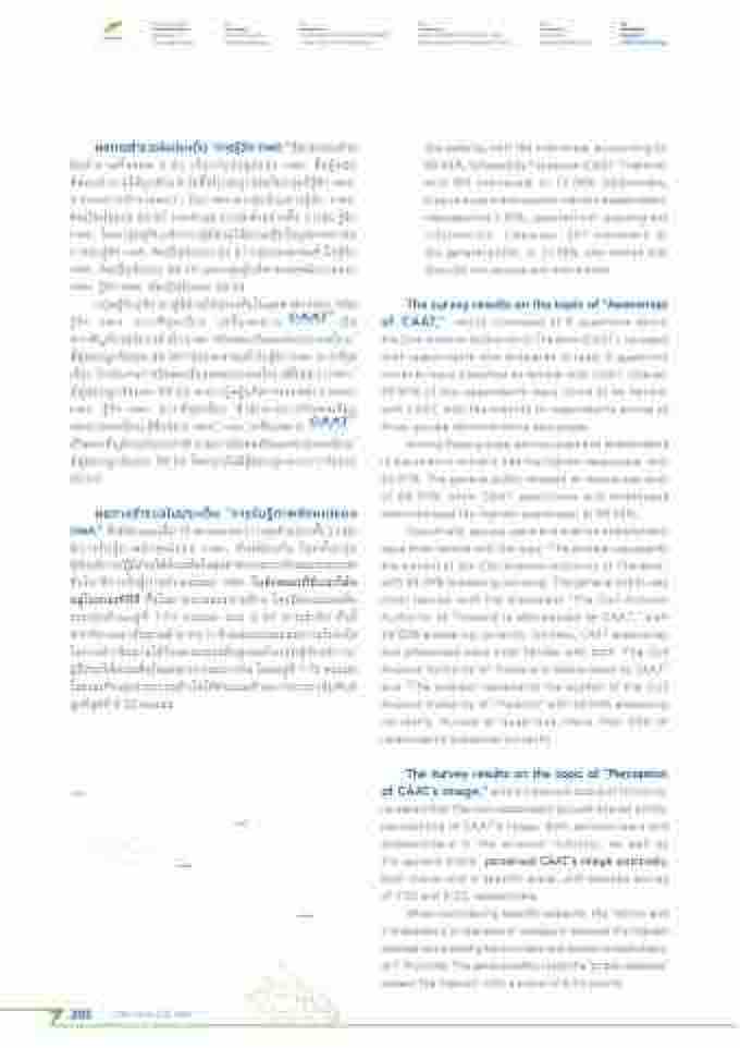 กลุ่มผู้้้รบิั บิรกิ าร/ผู้้้ม่สำ่วนได้้สำ่วนเสำ่ยในอุตัสำาหกรรมการบิิน ร้้จัก กพิ่ที่. มากที่่สำุด้เร้อง “เคัร้องหมาย เปี็น ตัราสำัญลักษณ์์ของสำําานักงานการบิินพิ่ลเร้อนแห่งปีระเที่ศไที่ย” ม่ผู้้้ตัอบิถึ้กร้อยละ 99.39 กลุ่มปีระช่าช่นที่ัวไปีร้จ้ ัก กพิ่ที่. มากที่่สำุด้ เรอ้ ง “สำําานักงานการบิินพิ่ลเรอ้ นแห่งปีระเที่ศไที่ย ม่ช่้อย่อว่า กพิ่ที่.” ม่ผู้้้ตัอบิถึ้กร้อยละ 98.62 และกลุ่มผู้้้บิริหารและพิ่นักงานของ กพิ่ที่. ร้้จัก กพิ่ที่. มากที่่สำุด้เร้อง “สำําานักงานการบิินพิ่ลเร้อน แห่งปีระเที่ศไที่ยม่ช่้อย่อว่ากพิ่ที่.”และ“เคัรอ้ งหมาย เปี็นตัราสำัญลักษณ์์ของสำําานักงานการบิินพิ่ลเรอ้ นแห่งปีระเที่ศไที่ย” ม่ผู้้้ตัอบิถึ้กร้อยละ 99.54 โด้ยทีุ่กข้อม่ผู้้้ตัอบิถึ้กมากกว่าร้อยละ 80.00