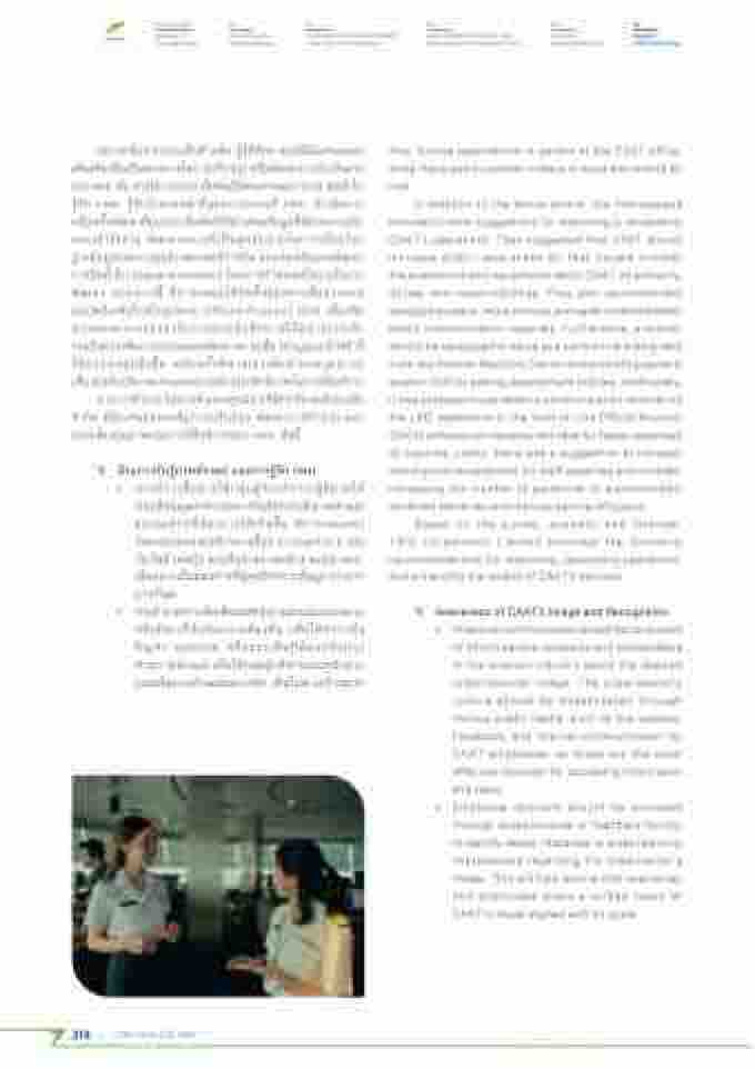 • Proactive communication should be conducted to inform service recipients and stakeholders in the aviation industry about the desired organizational image. The organization’s culture should be disseminated through various public media, such as the website, Facebook, and internal communication via CAAT employees, as these are the most effective channels for conveying information and news.