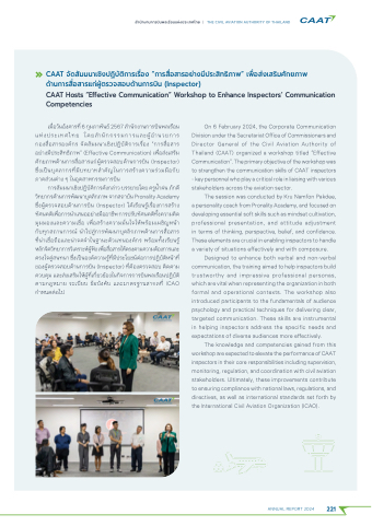 On 6 February 2024, the Corporate Communication Division under the Secretariat Office of Commissioners and Director General of the Civil Aviation Authority of Thailand (CAAT) organized a workshop titled “Effective Communication”. The primary objective of the workshop was to strengthen the communication skills of CAAT inspectors - key personnel who play a critical role in liaising with various stakeholders across the aviation sector.