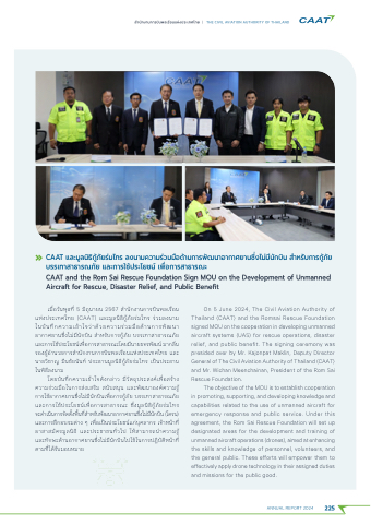 On 5 June 2024, The Civil Aviation Authority of Thailand (CAAT) and the Romsai Rescue Foundation signed MOU on the cooperation in developing unmanned aircraft systems (UAS) for rescue operations, disaster relief, and public benefit. The signing ceremony was presided over by Mr. Kajonpat Maklin, Deputy Director General of The Civil Aviation Authority of Thailand (CAAT) and Mr. Wichan Meenchainan, President of the Rom Sai Rescue Foundation.
