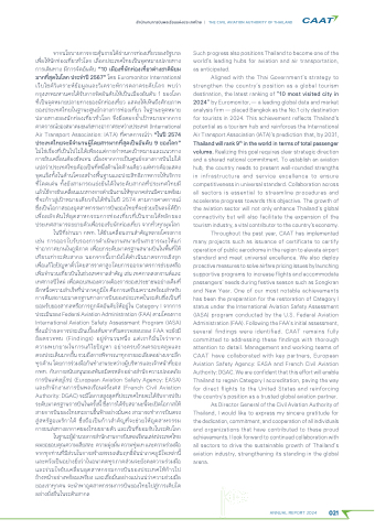 AsDirectorGeneraloftheCivilAviationAuthorityof Thailand, I would like to express my sincere gratitude for the dedication, commitment, and cooperation of all individuals and organizations that have contributed to these proud achievements. I look forward to continued collaboration with all sectors to drive the sustainable growth of Thailand’s aviation industry, strengthening its standing in the global arena.