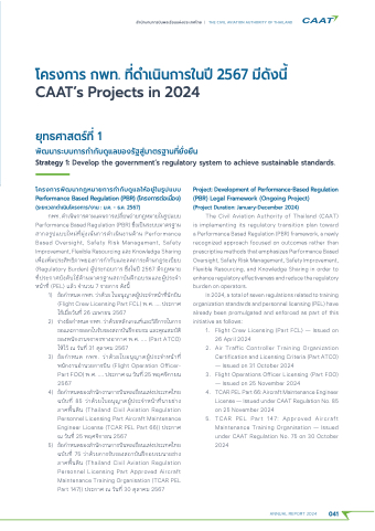 กพิ่ที่. ด้ําาเนินการตัามแผู้นการเปีล่ยนถึ่ายกฎหมายในร้ปีแบิบิ Performance Based Regulation (PBR) ซึ่ึงเปี็นระบิบิมาตัรฐาน สำากลร้ปีแบิบิใหม่ที่่มุ่งเน้นการด้ําาเนินงานด้้าน Performance Based Oversight, Safety Risk Management, Safety Improvement, Flexible Resourcing และ Knowledge Sharing เพิ่้อเพิ่ิมปีระสำิที่ธิภาพิ่ของการกําากับิและลด้ภาระด้้านกฎระเบิ่ยบิ (Regulatory Burden) ผู้้้ปีระกอบิการ ซึ่ึงในปีี 2567 ม่กฎหมาย ที่่ปีระกาศบิังคัับิใช่้ด้้านมาตัรฐานสำถึาบิันฝ่ึกอบิรมและผู้้้ปีระจําา หน้าที่่ (PEL) แล้ว จําานวน 7 รายการ ด้ังน่