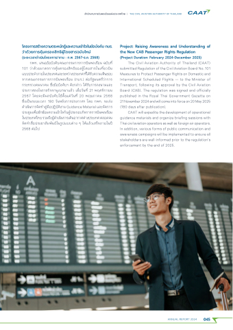 กพิ่ที่. เสำนอข้อบิังคัับิคัณ์ะกรรมการการบิินพิ่ลเรอ้ น ฉีบิับิที่่ 101 ว่าด้้วยมาตัรการคัุ้มคัรองสำิที่ธิของผู้้โด้ยสำารในเที่่ยวบิิน แบิบิปีระจําาภายในปีระเที่ศและระหว่างปีระเที่ศ ที่ไ่ ด้้รบิั คัวามเหน็ ช่อบิ จากคัณ์ะกรรมการการบิินพิ่ลเร้อน (กบิร.) ตั่อรัฐมนตัร่ว่าการ กระที่รวงคัมนาคัม ซึ่ึงข้อบิังคัับิฯ ด้ังกล่าว ได้้รบิั การลงนามและ ปีระกาศลงในราช่กิจจานุเบิกษาแล้ว เม้อวันที่่ 21 พิ่ฤศจิกายน 2567 โด้ยจะม่ผู้ลบิังคัับิใช่้ตัังแตั่วันที่่ 20 พิ่ฤษภาคัม 2568 ซึ่ึงเปี็นระยะเวลา 180 วันหลังการปีระกาศฯ โด้ย กพิ่ที่. จะเร่ง ด้ําาเนินการจัด้ที่ําาคั่้ม้อปีฏิิบิัตัิงาน Guidance Material และจัด้การ ปีระชุ่มเพิ่้อซึ่กั ซึ่อ้ มคัวามเข้าใจกับิผู้้้ปีระกอบิกิจการการบิินพิ่ลเรอ้ น ในปีระเที่ศไที่ย รวมถึึงผู้ด้้้ ําาเนินการเด้ินอากาศตั่างปีระเที่ศ ตัลอด้จน จัด้ที่ําาสำ้อปีระช่าสำัมพิ่ันธ์ในร้ปีแบิบิตั่าง ๆ ให้แล้วเสำร็จภายในปีี 2568 ตั่อไปี