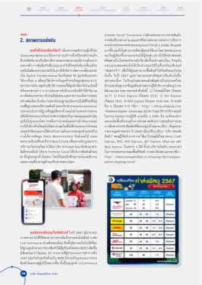 ปรัะเภท Social Commerce เปลียนช้่องทางกิารัข้ายสินค์้า จากิเด้ิมีทีข้ายผ่าน Facebook หรั่อผ่านช้่องทางเพัจติ่าง ๆ เป็นกิารั ข้ายผ่านช้่องทางข้อง Marketplace (TikTok, Lazada, Shopee) มีากิข้ึน ลูกิค์้าไมี่สามีารัถเล่อกิผู้ข้นส่งได้้เอง โด้ย Marketplace จะเป็นผู้เล่อกิช้ินงานกิรัะจายให้ผู้ข้นส่ง อย่างไรักิ็ด้ี ติลาด้ข้นส่ง พััสดุ้ด้่วันในไทยจะยังค์งเติิบโติเพัิมีข้ึนอย่างติ่อเน่อง ปัจจุบัน แทบทุกิแพัลติฟอรั์มีได้้เรัิมีนําาเสนอวัิด้ีโอสันพัรั้อมีฟีเจอรั์ “ติิด้ติะกิรั้า” เพั่อให้ผู้ช้มีสามีารัถซึ่่อสินค์้าได้้ทันทีข้ณะรัับช้มี ด้ังนัน ในปี 2567 มีูลค์่าติลาด้ข้นส่งพััสดุ้ด้่วันจึงเติิบโติข้ึน อย่างติ่อเน่อง ในปัจจุบันติลาด้ข้นส่งพััสดุ้ด้่วันในปรัะเทศไทย มีกิี ารัแข้ง่ ข้นั สงู จากิข้อ้ มีลู ด้ังกิลา่ วัพับวั่าผใู้ หบ้ รักิิ ารัรัายใหญ่ 5 รัาย มีีส่วันแบ่งกิารัติลาด้ติามีลําาด้ับด้ังนี 1) ไปรัษณีย์ไทย (รั้อยละ 26.7) 2) Flash Express (รั้อยละ 25.6) 3) J&T Express (รั้อยละ 23.6) 4) KEX Express (รั้อยละ 14.6) และ 5) ข้นส่ง อ่น ๆ (รั้อยละ 9.5) (ที่่มา : https : //blog.shippop.com /thailand-logistic-landscape-2024/) ปณท มีีกิารัปรัับกิลยุทธิ์ ในกิารัวัางแผนกิารัปฏิิบัติิ แบ่งเป็น 2 รัะด้ับ ค์่อ รัะด้ับองค์์กิรั และรัะด้ับพั่นที ค์วับค์ู่กิับกิารัทําาติลาด้เช้ิงรัุกิกิารัส่งเสรัิมีกิารัข้าย กิารัส่อสารัปรัะช้าสัมีพัันธิ์ทีติรังกิลุ่มีเป้าหมีาย (ที่่มา : ข้้อมูลจาก ราย์งานมูลค่่าตลาดฯ ปี 2565) เมี่อเปรัียบเทียบ “บรัิกิารัข้นส่ง สินค์้า” ข้องผู้ให้บรัิกิารั 8 รัาย ได้้แกิ่ ไปรัษณีย์ไทย, Kerry, Flash Express, DHL, SCG Express, J&T Express, Ninja van และ Best Express ในหลาย ๆ มีิติิ ทังค์่าบรัิกิารัเรัิมีติ้น รัะยะเวัลา ในกิารัข้นส่งค์รัอบค์ลุมีพั่นทีจัด้ส่ง รัายละเอียด้ติามีภาพั (ที่่มา : https : //www.moneybuffalo.in.th/saving-tips/compare- parcel-shipping-costs)