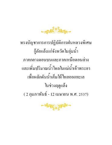 ทรงบัญชาการการปฏิบัติการฝนหลวงพิเศษ กู้ภัยแล้งแก่จังหวัดในลุ่มนํ้า ภาคกลางตอนบนและภาคเหนือตอนล่าง และเพิ่มปริมาณนํ้าไหลในแม่นํ้าเจ้าพระยา เพื่อผลักดันนํ้าเค็มให้ไหลออกทะเล ในช่วงฤดูแล้ง ( 2 กุมภาพันธ์ - 12 เมษายน พ.ศ. 2537)