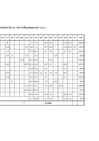 5 6 7 8 9 - - 31.4 - - - - - 11.4 - - - - - - - - 5.8 - - - - - - - - 3.8 - - - - - - - - - - - 6.8 1. ปฏิบัติการฝนหลวงถึง วันที่ 30 พฤษภาคม 2541 3. ฝ หมายถึง ฝนตกเล็กน้อยวัดจํานวนไม่ได้