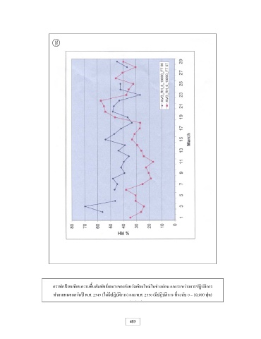 302 กราฟเปรียบเทียบความชื้นสัมพัทธ์เฉพาะของจังหวัดเชียงใหม่ในช่วงก่อน และระหว่างการปฏิบัติการ ทําลายหมอกควันปี พ.ศ. 2549 (ไม่มีปฏิบัติการ) และพ.ศ. 2550 (มีปฏิบัติการ ที่ระดับ 0 – 10,000 ฟุต) ี ใ ่ 453