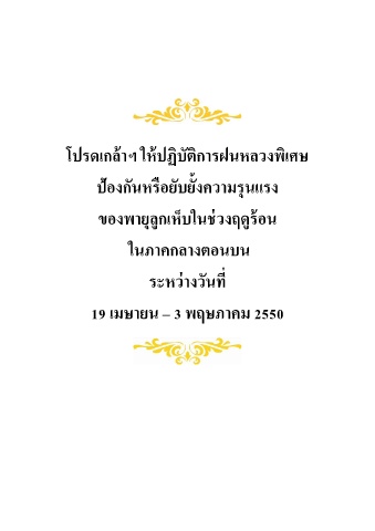 โปรดเกล้าฯ ให้ปฏิบัติการฝนหลวงพิเศษ ป้องกันหรือยับยั้งความรุนแรง ของพายุลูกเห็บในช่วงฤดูร้อน ในภาคกลางตอนบน ระหว่างวันที่ 19 เมษายน – 3 พฤษภาคม 2550
