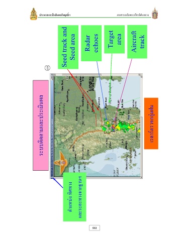 ประมวลและยืนยันผลสัมฤทธิ์ฯ เอกสารเฉลิมพระเกียรติฝนหลวง Target area Radar echoes Aircraft track Seed track and Seed area 410 เรดาร์ตรวจกลุ่มฝน ระบบติดตามและประเมินผล ตําแหน่ง ทิศทาง และระยะทางจากฐานฯ 532