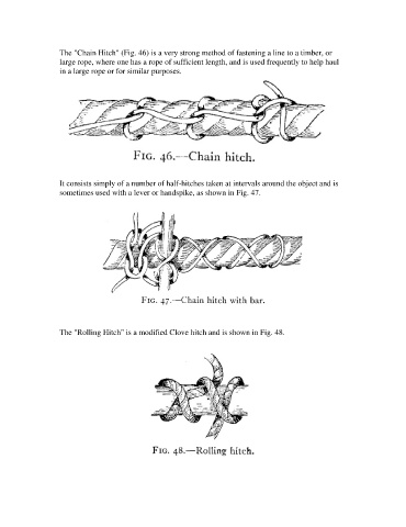 The "Chain Hitch" (Fig. 46) is a very strong method of fastening a line to a timber, or