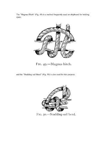 The "Magnus Hitch" (Fig. 49) is a method frequently used on shipboard for holding spars; and the "Studding-sail Bend" (Fig. 50) is also used for this purpose.