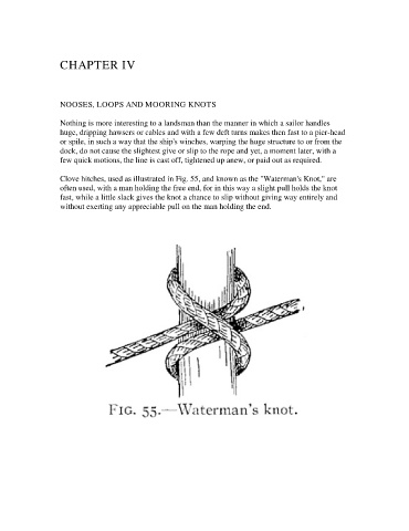Clove hitches, used as illustrated in Fig. 55, and known as the "Waterman's Knot," are
