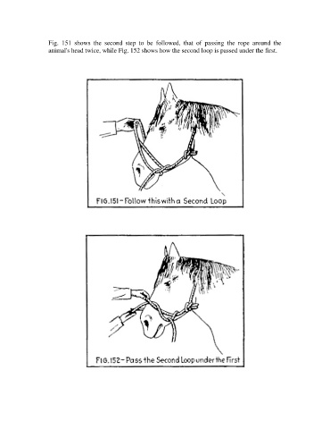 Fig. 151 shows the second step to be followed, that of passing the rope around the animal's head twice, while Fig. 152 shows how the second loop is passed under the first.