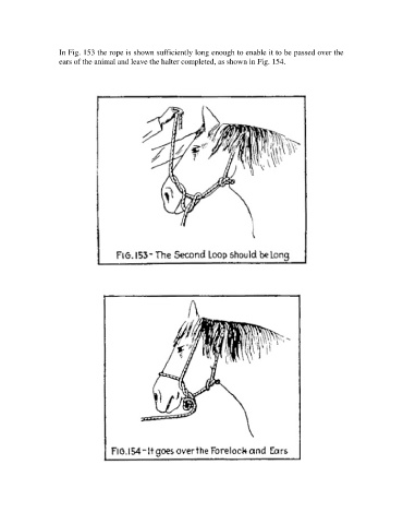 In Fig. 153 the rope is shown sufficiently long enough to enable it to be passed over the ears of the animal and leave the halter completed, as shown in Fig. 154.