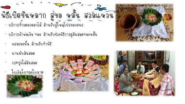 พิธีเปิดขันหมาก สู่ขอ หมั้น สวมแหวน - บริการข้าวตอกดอกไม้ ส าหรับผู้ใหญ่โปรยอวยพร - บริการผ้าห่อเงิน-ทอง ส าหรับช่วงพิธีการดูสินสอดทองหมั น - พรมรองพื น ส าหรับท าพิธี - พานนับสินสอด - กระปุงใส่สินสอด - ใบเงินใบทองใบนาค