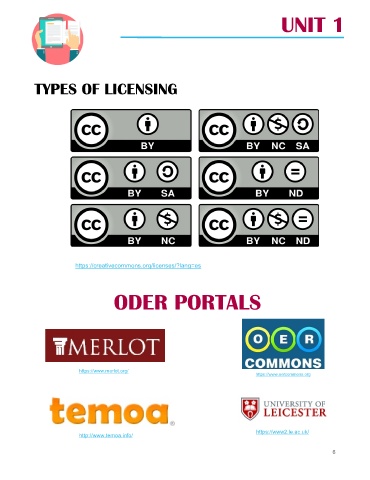 UNIT 1 TYPES OF LICENSING https://creativecommons.org/licenses/?lang=es ODER PORTALS https://www.merlot.org/ https://www.oercommons.org https://www2.le.ac.uk/ http://www.temoa.info/ 6