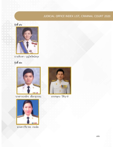 JUDICIAL OFFICE INDEX LIST, CRIMINAL COURT 2020 รุนที่ 46 นางเพียงตา บุญไพรัตนสกุล รุนที่ 53 นางสาวปกฉัตร เผือกสุวรรณ นายชนุดม ปติฤกษ นางสาววิรียาพร งามนิล ๑๒