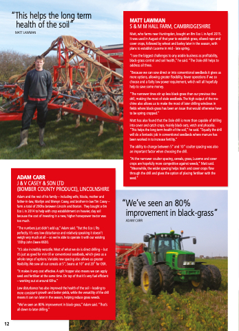 “The narrower tines stir up less black-grass than our previous tine drill, making the most of stale seedbeds. The high output of the ma- chine also allows us to make the most of later drilling windows in fields where black-grass has been an issue that would otherwise have to be spring cropped.”