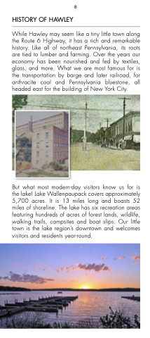 While Hawley may seem like a a a a a a a a a a tiny little town along the the Route 6 Highway it it it has a a a a a a a a a a a a a a rich and remarkable history Like all of northeast Pennsylvania its roots are tied to to lumber and and farming Over the the years our our economy has been nourished and and and fed by textiles glass and and and more What we are most famous for for is is the transportation by barge and and and later railroad for for anthracite coal and and Pennsylvania bluestone all headed east for the building of New York City But what most modern-day visitors know us for is is the lake! Lake Wallenpaupack covers approximately 5 5 700 acres It is 13 miles miles long and boasts 52 miles miles of of of shoreline The lake has six recreation areas featuring hundreds of of of acres of of of forest lands wildlife walking trails campsites and and and boat slips Our little town town is the lake region’s downtown and and welcomes visitors and residents year-round