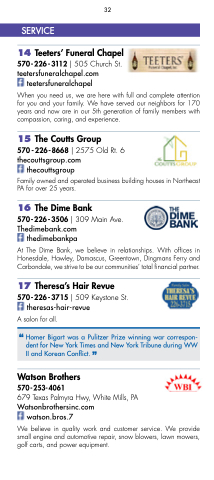 At The Dime Bank we believe in in in relationships With offices in in in Honesdale Hawley Damascus Greentown Dingmans Ferry and Carbondale we strive to to to be our communities’ total financial partner 17 Theresa’s Hair Revue 570-226-3715 | 509 Keystone St theresas-hair-revue