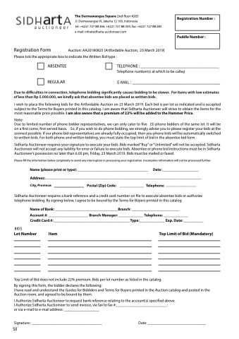 Sidharta Auctioneer requires your signature to execute your bids. Bids marked “Buy” or “Unlimited” will not be accepted. Sidharta Auctioneer will not accept any liability for error or failure to execute bids. Absentee or phone bid instructions must be in Sidharta Auctioneer’s possession no later than 6.00 pm, Friday, 23 March 2019. Bids must be mailed or faxed.