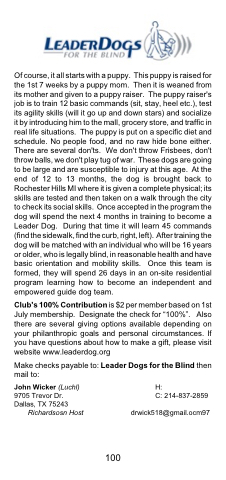 Club's 100% Contribution is $2 per member based on 1st July membership. Designate the check for “100%”. Also there are several giving options available depending on your philanthropic goals and personal circumstances. If you have questions about how to make a gift, please visit website www.leaderdog.org