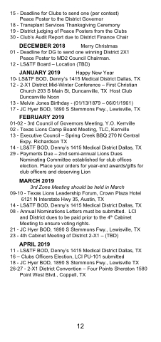 14 - LS&TF BOD, Denny’s 1415 Medical District Dallas, TX 29 - Payments Due – 2nd semi-annual Lions Dues