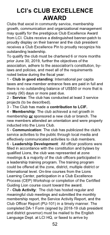 Clubs that excel in community service, membership growth, communication and organizational management may qualify for the prestigious Club Excellence Award from LCI. Clubs receive a distinguished banner-patch to proudly display on their banner and the club president receives a Club Excellence Pin to proudly recognize his outstanding leadership.