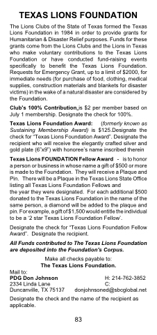TexasLionsFOUNDATIONFellowAward - istohonor a person or business in whose name a gift of $500 or more is made to the Foundation. They will receive a Plaque and Pin. TherewillbeaPlaqueintheTexasLionsStateOffice listing all Texas Lions Foundation Fellows and