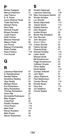 28 Shobhit Saberwal 47 31 Lawrence Sanchez 118 110 Mary Dominguez-Santini 35 26 Woody Schober 67 41 Lou Schultz 98 26 Randy Sepulvado 113 28 Daniel Shank 114 63 Debilal Sharma 37 37 Glen Shepard 113 41 Imelda Shirani 26 20 Bheeh Raj Shiwakoti 26 112 Dan Shuman 110 43 John Simpson 117 99 Steven Sikes 23 115 Coleen Sinclair 24 28 Patrick Sinclair 24 27 Dheeraj Singh 47 118 Michael Smalley 115 44 Larkin Smith 112