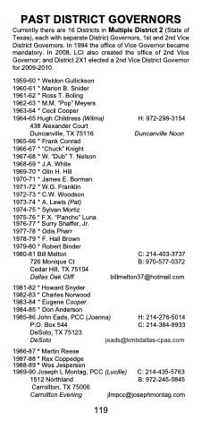 Currently there are 16 Districts in Multiple District 2 (State of Texas), each with separate District Governors, 1st and 2nd Vice District Governors. In 1994 the office of Vice Governor became mandatory. In 2008, LCI also created the office of 2nd Vice Governor; and District 2X1 elected a 2nd Vice District Governor for 2009-2010.