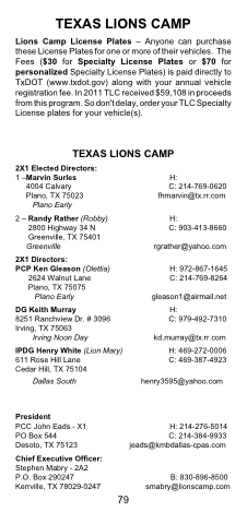 Lions Camp License Plates – Anyone can purchase these License Plates for one or more of their vehicles. The Fees ($30 for Specialty License Plates or $70 for personalized Specialty License Plates) is paid directly to TxDOT (www.txdot.gov) along with your annual vehicle registration fee. In 2011 TLC received $59,108 in proceeds from this program. So don't delay, order your TLC Specialty License plates for your vehicle(s).