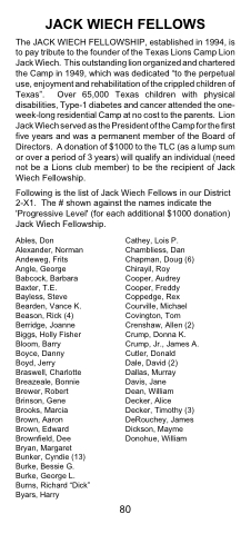 The JACK WIECH FELLOWSHIP, established in 1994, is to pay tribute to the founder of the Texas Lions Camp Lion Jack Wiech. This outstanding lion organized and chartered the Camp in 1949, which was dedicated “to the perpetual use, enjoyment and rehabilitation of the crippled children of Texas”. Over 65,000 Texas children with physical disabilities, Type-1 diabetes and cancer attended the one- week-long residential Camp at no cost to the parents. Lion Jack Wiech served as the President of the Camp for the first five years and was a permanent member of the Board of Directors. A donation of $1000 to the TLC (as a lump sum or over a period of 3 years) will qualify an individual (need not be a Lions club member) to be the recipient of Jack Wiech Fellowship.