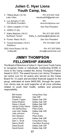 The Board of Directors of Julien C. Hyer Lions Youth Camp to recognize Clubs or individuals contributing $1000 or more to the Camp created the Jimmy Thompson Fellow Award in 2012. The award honors Lion Jimmy Thompson (an active Lion for 42 years) who served on the Camp Board for 12 years and provided financial support to the group, estimated at some $400,000, through the years. Lion Jimmy was an avid supporter of all Lions activities related to youth their health, welfare and personal responsibility.