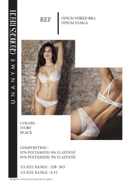REF OPIUM WIRED BRA OPIUM TANGA COLORS : IVORY BLACK COMPOSITION : 92% POLYAMIDE/ 8% ELASTANE 91% POLYAMIDE/ 9% ELASTANE US SIZE RANGE : 32B- 36D US SIZE RANGE : 4-12 Designed in France by Georges Rech Lingerie