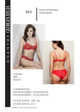 REF ELISE WIRED BRA ELISE BRIEF COLORS : RED BLACK COMPOSITION : 85% POLYAMIDE / 15% ELASTANE 85% POLYAMIDE / 15% ELASTANE US SIZE RANGE : 32B- 36D US SIZE RANGE : 4-12 Designed in France by Georges Rech Lingerie