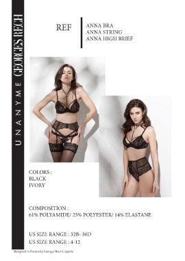 REF ANNA BRA ANNA STRING ANNA HIGH BRIEF COLORS : BLACK IVORY COMPOSITION : 61% POLYAMIDE/ 25% POLYESTER/ 14% ELASTANE US SIZE RANGE : 32B- 36D US SIZE RANGE : 4-12 Designed in France by Georges Rech Lingerie
