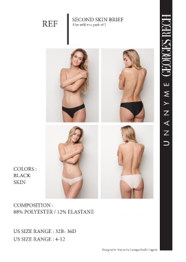REF SECOND SKIN BRIEF Also sold in a pack of 2 COLORS : BLACK SKIN COMPOSITION : 88% POLYESTER / 12% ELASTANE US SIZE RANGE : 32B- 36D US SIZE RANGE : 4-12 Designed in France by Georges Rech Lingerie