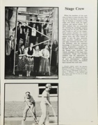 almost every day after school in order to turn the pine, plywood, flats, masonite, cardboard, canvas and other materials into these sets. Jim Williams, with his extensive knowledge of electronics and com puters, programed a computer on the light board to flash light cues at the proper time intervals. Jim Adams, president of the stage crew, commented; “Stage crew provides students with the opportunity to learn a craft, an important aspect of one’s development.” Judging from the final results, the students have learned this craft well.1