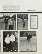 1. Randy Rogers yells “fore” to warn onlookers before addressing the ball. 2. Greg Cordasco practices keeping his head down throughout his swing. 3. GOLF TEAM, LEFT TO RIGHT, FRONT ROW: A. Bowman, G. Stolz, M. Albano, J. Twill, A. Horowitz, E. Einhorn; SECOND ROW: G. Carpene, D. Vogel, B. Calkins, G. Cordasco, W. Gerber, R. Rogers, C. Braun, M. Lackland, Coach Richard Page. 4. As his teammates look on with astonishment, Randy Rogers gasps over his low score. 5. Bruce Calkins prepares to tee off. 6. Randy Rog ers, team captain, and Coach Richard Page. 7. Chip Gerber assumes a comfortable stance before hitting the ball down the fairway.