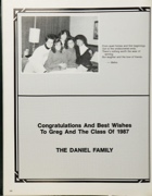 200 Congratulations And Best Wishes To Greg And The Class Of 1987 THE DANIEL FAMILY From quiet homes and first beginnings Out to the undiscovered ends, There’s nothing worth the wear of T winning But laughter and the love of friends. — Belloc