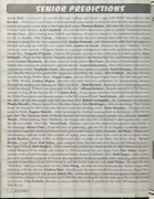 fighter after shaving the president's cat from the tree. Lauren Fedechena...W ins the Golden Globe for bes supporting actress. Stephanie Fraser...Becomes the next queen of comedy. Sarah Freeman...Becomes th( next Martha Stewart but genetically engineers everything she makes. Alex Galitzer...Becomes the nex host for the Regis Philbin Show. Nupur Gupta...Invents the Nupur Super Duper Fire Ball and gets hirec by Willy Wonka. Lindsay Hegna...Becomes the tenth Survivor millionaire by manipulating alliance through the singing and dancing of "Baby Got Back." Matt Howard...Starts his own landscaping servio under the slogan "If there's no grass play in the dirt." Allison Kalman...Travels around in a VW Van on; mission to hug all the trees in the U.S. James Kim...Forges peace between North and South Korea win the Nobel Peace prize and donates money to the WH Annual Fund. SaraLybeck...after much controvers’ she rides off into the sunset with NO one from WH. Robert Livingston...Dr. Livingston we presume Phoebe Marulli...Weaves herself in to Brooklyn Society. Eric Merklinger...After re-inventing "The Chickei Soap" he returns to WH to become the first male cheerleading coach. Afam Moneme...Changes his las name to Smith. Eugene Moretti...After becoming the shortest running back in the history of the NFL h gets into The Guinness Book of World Records for having the largest purple car collection. Jeannin' Morris...While stalking Dave Matthews she bumps into the CEO of Hershey's and together they creaf the life size edible "Dave Bar." Kevin Park...Marries a girl over the Internet but question the validity o the marriage. Soniya Patel...From her love of gardening, gets her Ph. D. in Organic Gardening opens . successful vegetable stands in Edison which goes world wide in under 2 months. Avi Perez...Starts a nev cheerleading uniform trend that consists of taping your arms from your wrist to pit in school colors Justin Restivo...Makes it BIG in Hollywood after re-make of the Dick Van Dyke Show. Beverh Rivero...Carpe Diem. Don Sidun...gets a degree from Harvard and over throws Kef Wilson as head o the Upper School. Ravi Singhvi...After a near fatal accident as a stunt double for Mel Gibson on the set o Lethal Weapon 10 he retires and returns to WH becoming the new Soup Nazi. Dev Sinha...Begins serious workout and becomes a professional Indian dancer at Delilah's Den. Beth Treger...After startin; her own yearbook company in Erance she encounters financial troubles after receiving and exuberan amount of speeding tickets and is forced to sell her lovely locks for cash. Josh Vietze...Becomes the nex "Bob Ross" after growing back his fro. Chris Wang...Invents the first hydroelectric station wagon afte tinkering with his old one. Lindsay W est...EinaIIy puts the years of ballet lessons to use as a Vegas Shov Girl making her parents very proud. Jimmy Wu...while attending a Lakers Knicks game at the Garden h is selected to attempt a half court shot for $1,000,000, after making the shot he ends up as the new McDonald spokesman. Dan Zuchnik...Becomes a racecar driver but fails to qualify for the Indy 500 because someon stole liis car.