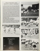 This year's field hockey season was greatly influ enced by the weather with several games rained out. For the first time in several years the turnout was sufficient so that a fewjunior varsity games could be played. The greater number of players allowed for tremendous development of positional play as scrim mages became a big part of every practice. Although the team's record of 3-6 was not as good as was hoped, the team did play up to its potential for most of the season. The highlight of the season was the Homecoming Game. Hot only did they beat Staten